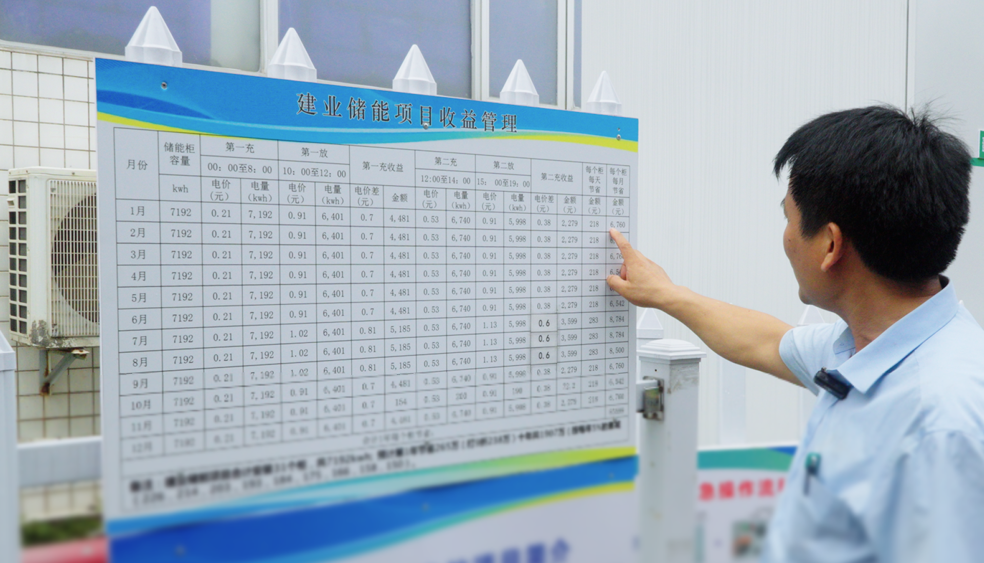 项目现场设有清晰的收益展示牌,以月为单位公示电价、充放电量及单柜收益数据。按照现行政策,据模型预测,该项目预计每年可为建业电子节省电费约300万元。这不仅是对项目收益模型的可视化呈现,更是华昱欣对客户价值承诺的实践。